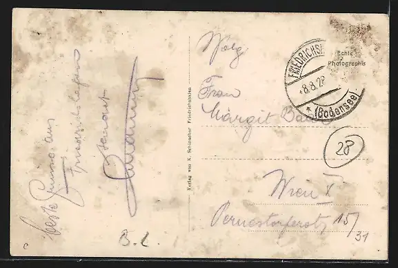 Personenbezogene Daten auf der Rückseite der Karte wurden durch blauen Textmarker unkenntlich gemacht. Die blauen Stellen sind auf die Vorderseite durchgeweicht und wirken sich negativ auf das Postkartenfoto aus