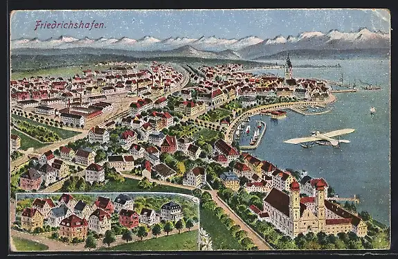 Künstler-AK Friedrichshafen, Zeppelin über der Stadt