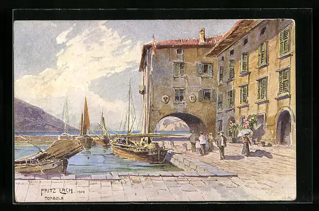 Künstler-AK Fritz Lach: Torbole, Partie am Hafen
