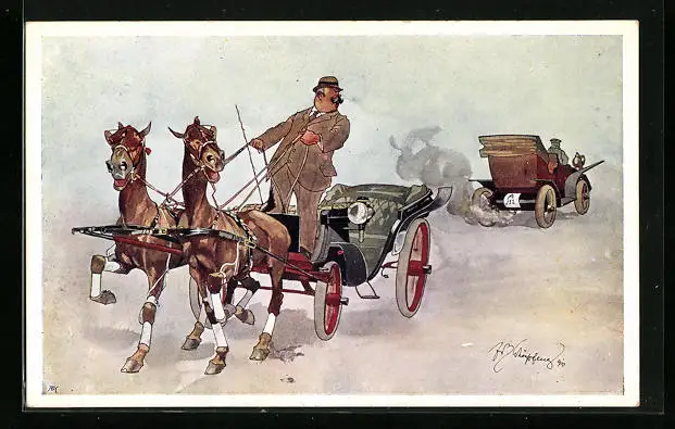 Künstler-AK Fritz Schönpflug: Herr mit Pferdegespann fährt an Auto vorbei