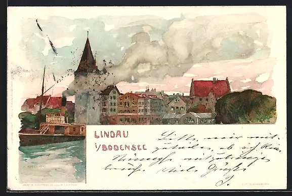 Künstler-AK Fritz Voellmy: Lindau, Teilansicht mit Dampfer