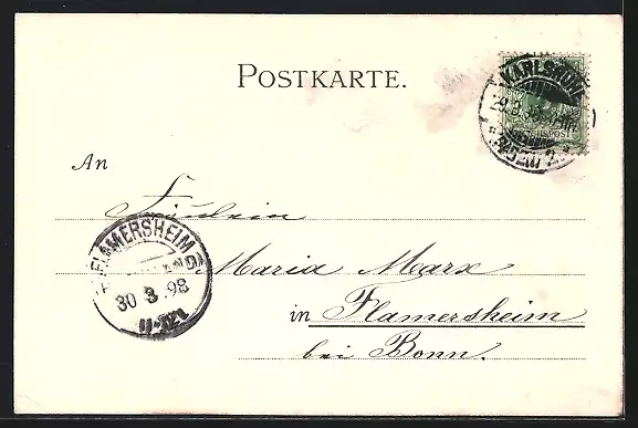 alte Ansichtskarte, gelaufen 1898, Eckknick unten re., Stempelspur, guter Zustand