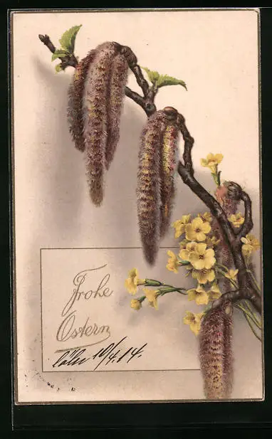 Künstler-AK Frohe Ostern, Weidenkätzchen mit Blüten