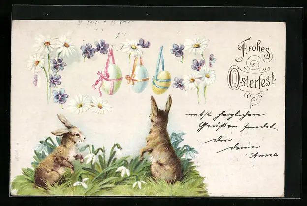 Künstler-AK Frohes Osterfest, Osterhasen mit Eiern