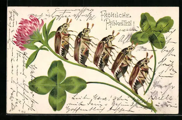Künstler-AK Fünf Maikäfer in einer Reihe auf einem Kleezweig, Pfingstgruss
