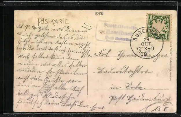 Personenbezogene Daten auf der Rückseite der Karte wurden durch blauen Textmarker unkenntlich gemacht. Die blauen Stellen sind auf die Vorderseite durchgeweicht und wirken sich negativ auf das Postkartenfoto aus