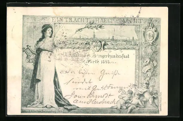 Künstler-AK Fürth, Sängerfest 1898 - Frau mit Harfe, Ortsansicht, Engel