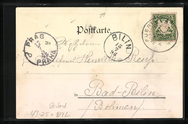Personenbezogene Daten auf der Rückseite der Karte wurden durch blauen Textmarker unkenntlich gemacht. Die blauen Stellen sind auf die Vorderseite durchgeweicht und wirken sich negativ auf das Postkartenfoto aus