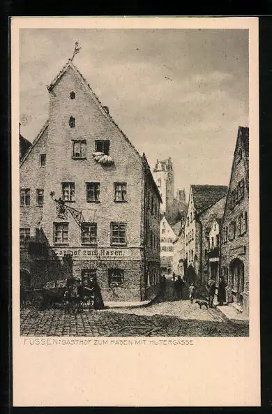 Künstler-AK Füssen, Strassenpartie mit Gasthof zum Hasen und Hutergasse
