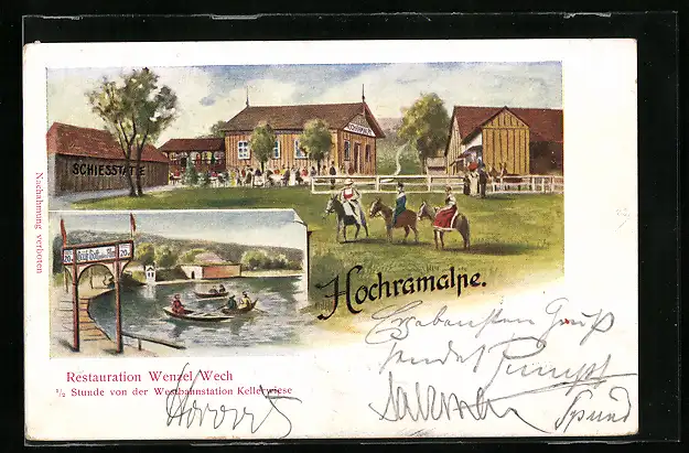 Künstler-AK Gablitz, Hochramalpe, Restaurant Wenzel Wech, Uferpartie mit Booten