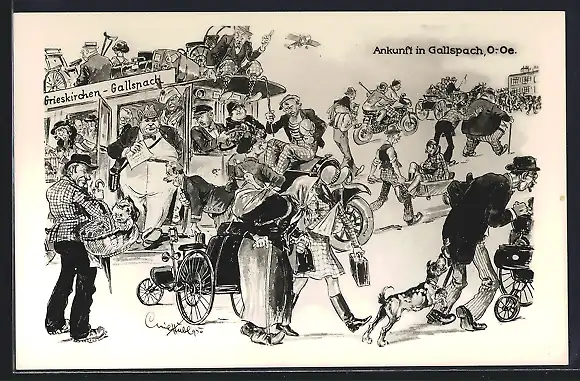 Künstler-AK Gallspach, Strassenleben mit Bus, Auto, Motorrad & Schubkarren