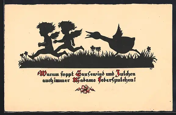 Künstler-AK Gans jagt zwei Engel über eine Wiese