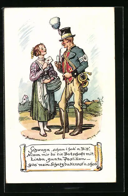Künstler-AK Ganzsache: Junge Frau gibt beim Postillon einen Brief auf