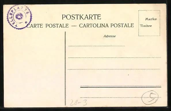 Personenbezogene Daten auf der Rückseite der Karte wurden durch blauen Textmarker unkenntlich gemacht. Die blauen Stellen sind auf die Vorderseite durchgeweicht und wirken sich negativ auf das Postkartenfoto aus