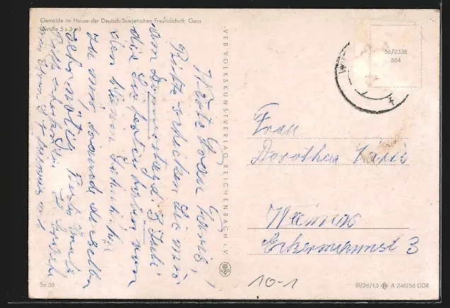Personenbezogene Daten auf der Rückseite der Karte wurden durch blauen Textmarker unkenntlich gemacht. Die blauen Stellen sind auf die Vorderseite durchgeweicht und wirken sich negativ auf das Postkartenfoto aus