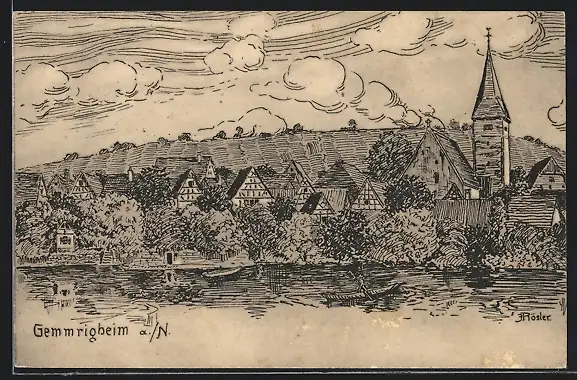 Künstler-AK Gemmrigheim a. N., Ortsansicht mit Uferpartie