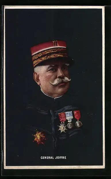 Künstler-AK General Joffre in Uniform mit Schirmmütze und Orden