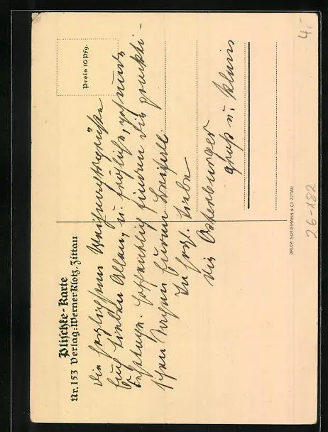 Personenbezogene Daten auf der Rückseite der Karte wurden durch blauen Textmarker unkenntlich gemacht. Die blauen Stellen sind auf die Vorderseite durchgeweicht und wirken sich negativ auf das Postkartenfoto aus
