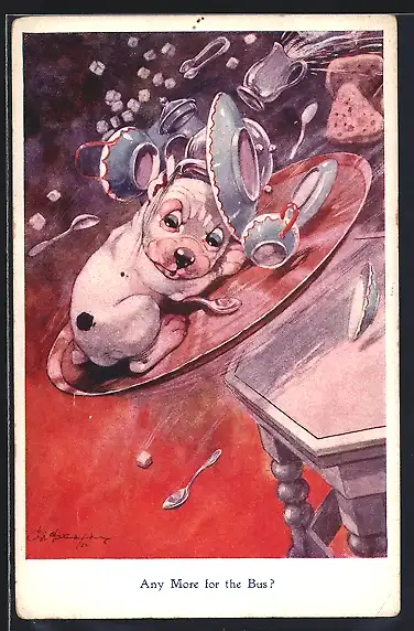 Künstler-AK George Ernest Studdy: Bonzo rutscht auf einem Tablett vom Tisch