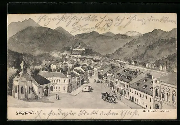 Künstler-AK Gloggnitz, Ortspartie aus der Vogelschau
