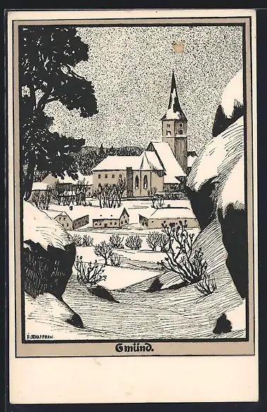 Künstler-AK Gmünd, Ortsansicht im WInter mit Kirche