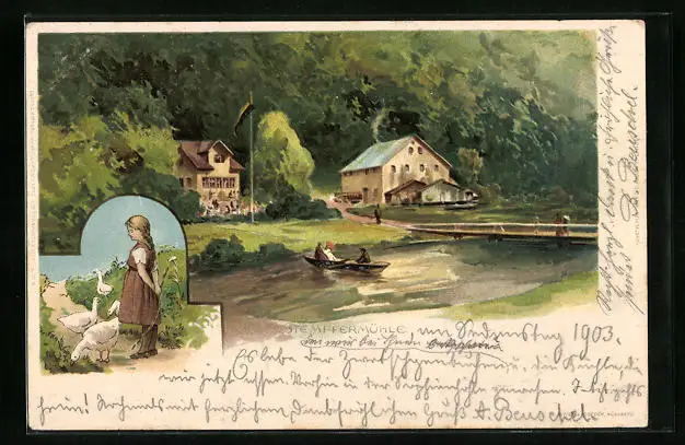 Künstler-AK Gössweinstein, Gasthaus Stempfermühle, Gänsemädchen