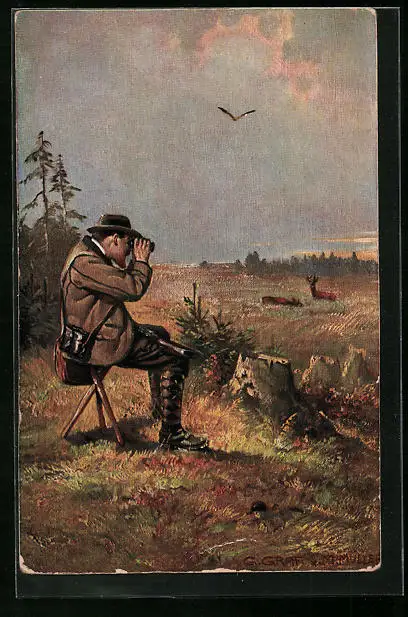 Künstler-AK Gottfried Graf: Jäger beobachtet äsendes Rotwild