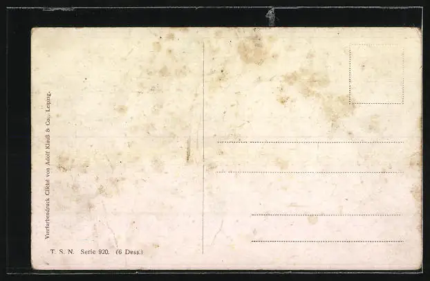 Personenbezogene Daten auf der Rückseite der Karte wurden durch blauen Textmarker unkenntlich gemacht. Die blauen Stellen sind auf die Vorderseite durchgeweicht und wirken sich negativ auf das Postkartenfoto aus
