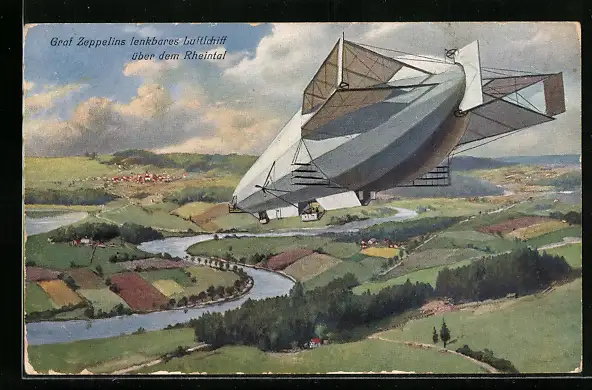 Künstler-AK Graf Zeppelins lenkbares Luftschiff über dem Rheintal