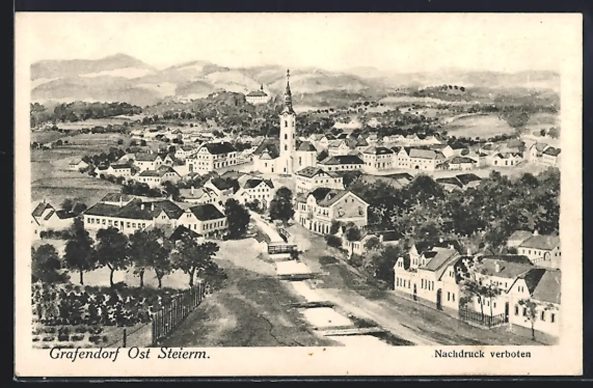 Künstler-AK Grafendorf /Ost Steierm., Ortsansicht mit Kirche