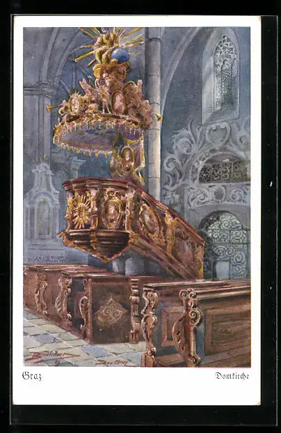 Künstler-AK Graz, Domkirche, Innenansicht Kanzel mit Bänken