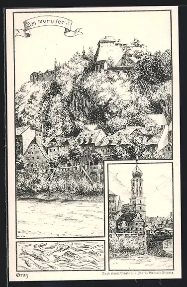Künstler-AK Graz, Teilansicht, Flusspartie, Fische