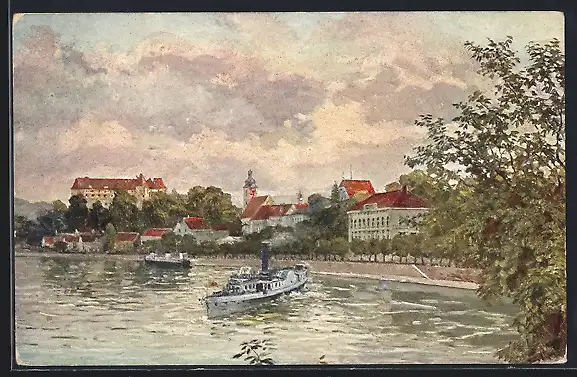 Künstler-AK Grein a. d. Donau, Strudengau, Dampfschiff vor der Uferpromenade