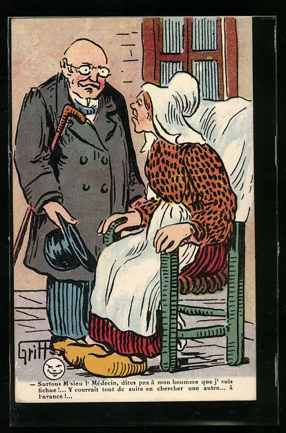 Künstler-AK Griff: Mann mit Stock und Hut und Frau mit Haube