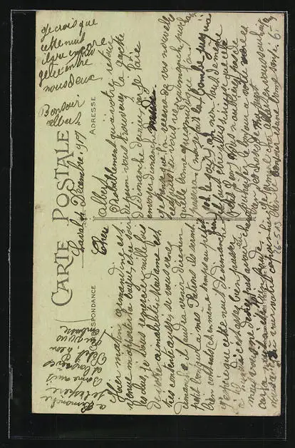 Personenbezogene Daten auf der Rückseite der Karte wurden durch blauen Textmarker unkenntlich gemacht. Die blauen Stellen sind auf die Vorderseite durchgeweicht und wirken sich negativ auf das Postkartenfoto aus