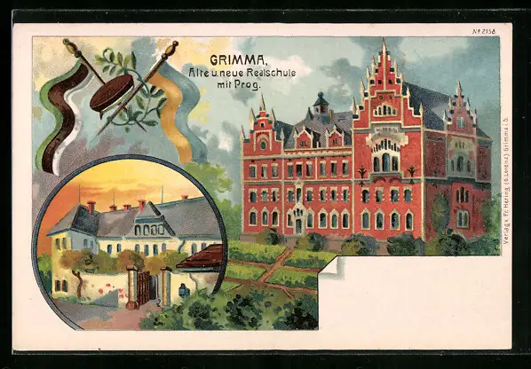 Künstler-AK Grimma, Alte & neue Realschule mit Prog.