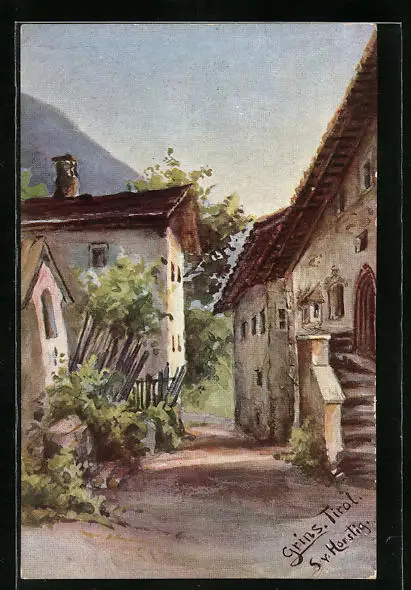 Künstler-AK Grins, Alte Häuser im Dorf