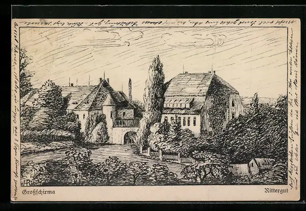 Künstler-AK Grossschirma, Rittergut aus der Vogelschau