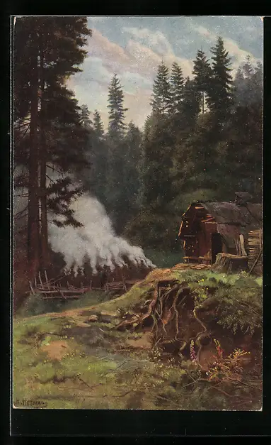 Künstler-AK H. Junker: Köhlerhütte im Wald