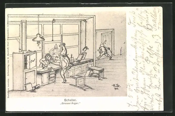 Künstler-AK H. Starkloff: Schalter, Grosser Ärger
