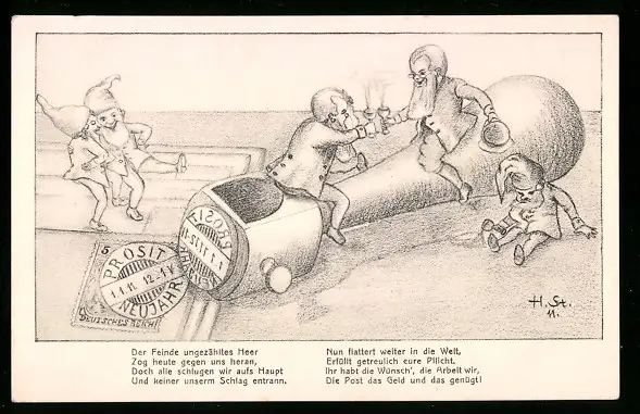 Künstler-AK H. Starkloff: Zwerge auf Poststempel feiern Neujahr
