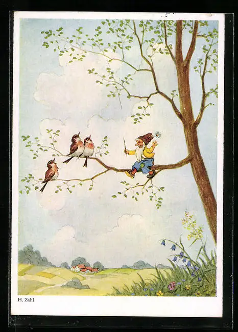Künstler-AK H. Zahl: Zwerg dirigiert einen Rotkehlchenchor
