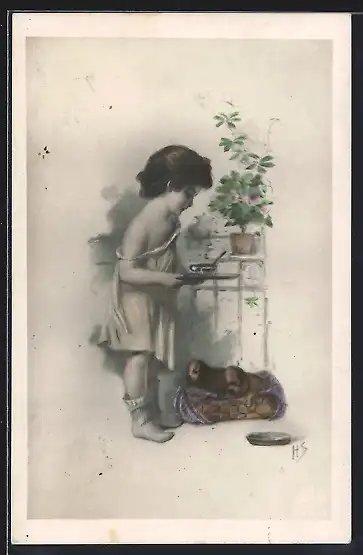 Künstler-AK H.S.: Kleines Mädchen füttert zwei Welpen