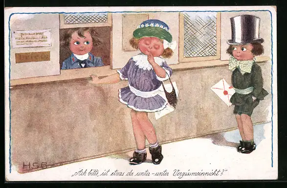 Künstler-AK H.S.B.: Ach bitte, ist etwas da unter - unter Vergissmeinnicht?