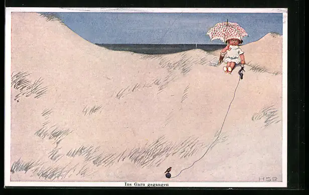 Künstler-AK H.S.B.: Kleiner Strandnixe ist ein Vogel ins Garn gegangen