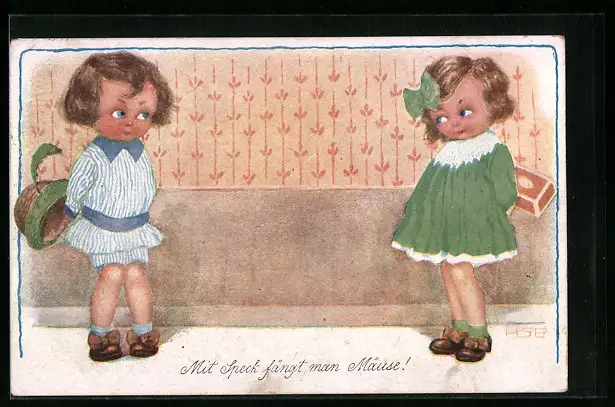 Künstler-AK H.S.B.: Mädchen mit Päckchen hinter dem Rücken, Mit Speck fängt man Mäuse