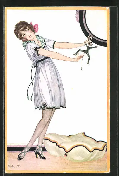 Künstler-AK Hahn: Frau in kurzem Kleid mit Hampelmann-Puppe eines Mannes