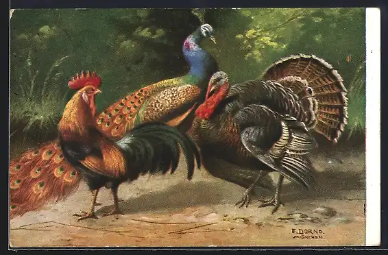 Künstler-AK Hahn, Truthahn und männlicher Pfau