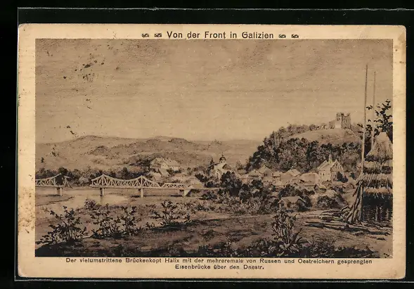 Künstler-AK Halix, Brückenkopf mit Eisenbahnbrücke über den Dnestr