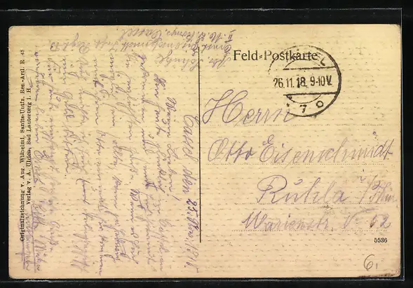 Personenbezogene Daten auf der Rückseite der Karte wurden durch blauen Textmarker unkenntlich gemacht. Die blauen Stellen sind auf die Vorderseite durchgeweicht und wirken sich negativ auf das Postkartenfoto aus
